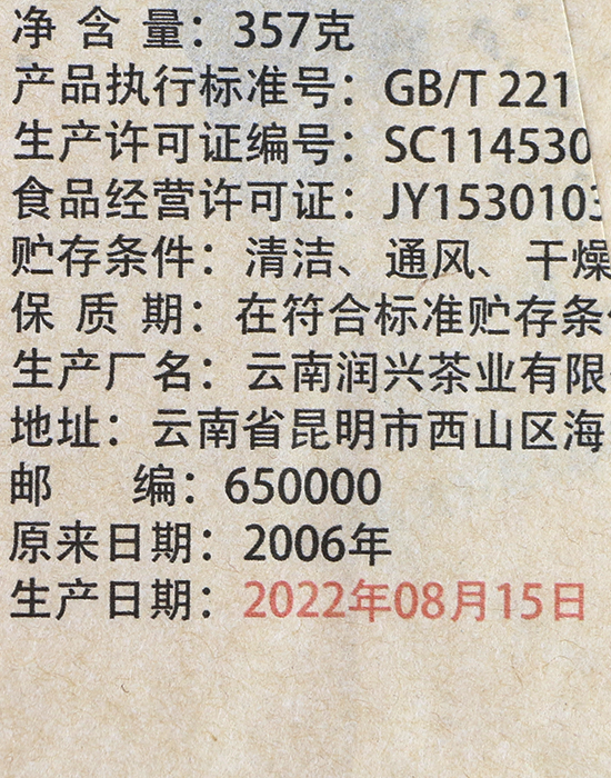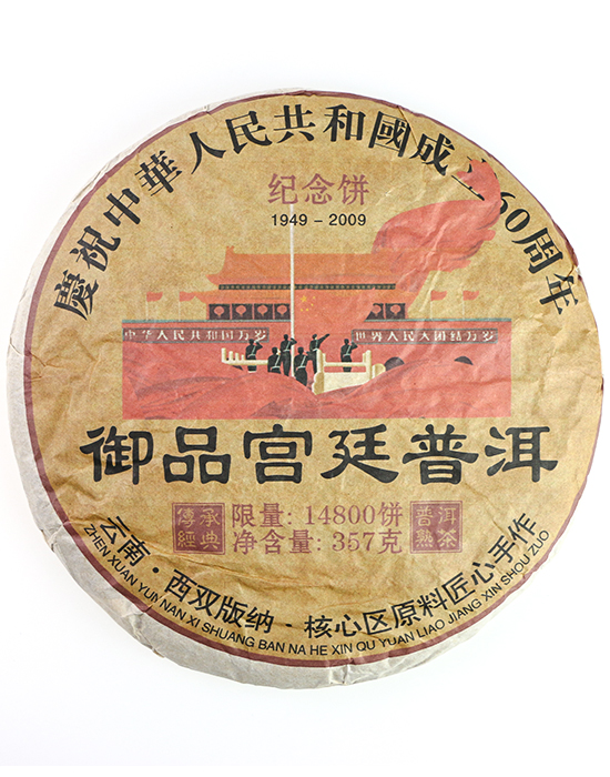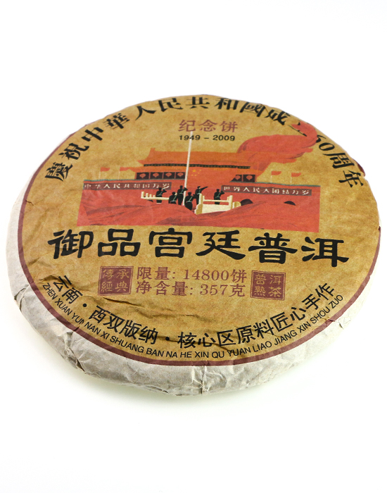 Блин выпущен в 2022 году к годовщине основания КНР — одному из главных государственных праздников в истории Китая. На обёртке изображены ворота Тяньаньмэнь и праздничная процессия, а тираж составил всего 14 800 блинов — ничтожно мало для мирового рынка пуэра. Такие памятные выпуски с каждым годом становятся всё более редкими: часть тиража оседает у коллекционеров, часть выпивается. Найти блин из сырья 2006 года по хорошей цене — уже удача.