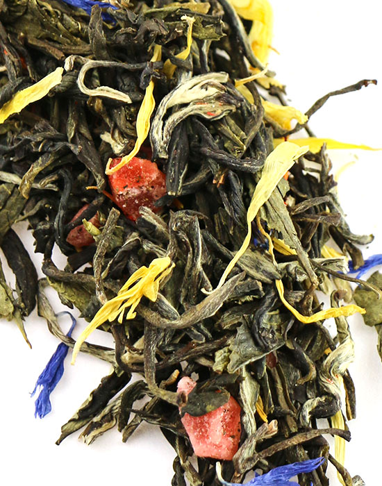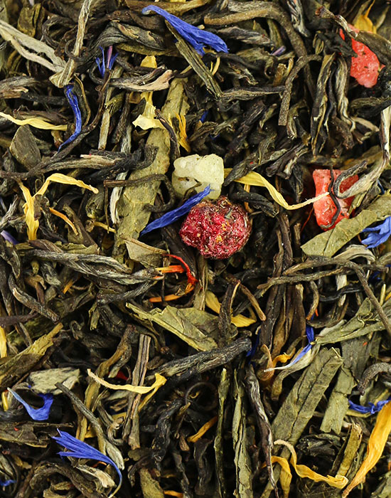 В основе — сенча, классический зелёный чай с травяным, слегка морским вкусом и мягкой терпкостью. Вокруг неё выстроен яркий многослойный букет: клубника — сочная, летняя, главный акцент купажа; манго округляет вкус тропической сладостью; мандарин добавляет свежую цитрусовую ноту; смородина вносит приятную кислинку; яблоко смягчает и балансирует весь состав. Цветочный блок — османтус с медово-персиковым ароматом и нежный жасмин — придаёт чаю восточный шарм и глубину. Золотистые лепестки календулы украшают заварку и завершают образ.
