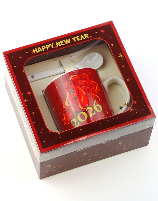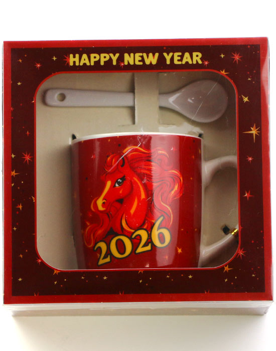 Чашка для чая на Рождество, кружка для кофе Красный Конь принесет успех в 2026, новогодний подарок, набор посуды кружка с ложкой в подарочной коробке, объем 200 мл, керамика, Happy New Year