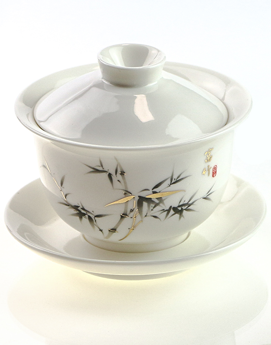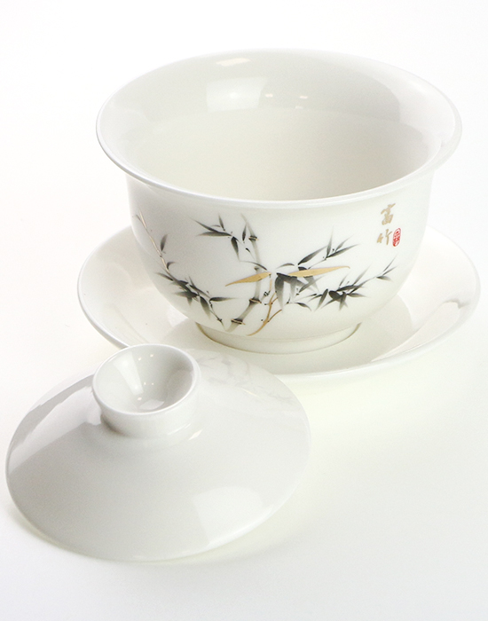 Гайвань “Бамбук”, чаша для заваривания чая с парящей крышкой и блюдцем, гайвань с “левитирующей” крышкой, gaiwan with hovering lid, китайский фарфор белый нефрит Дэхуа, объём 150 мл