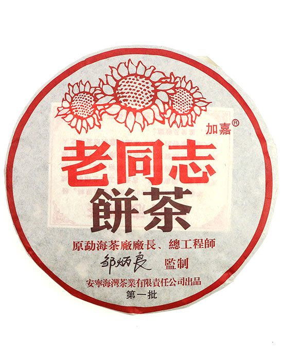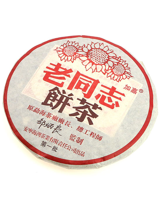 Чай пуэр, китайский чай Шу Пуэр Старый Товарищ, авторский чай чайного мастера Цоу Бин Лян, Лао Тун Чжи ( Haiwan Old Comrade Puer Tea, 海湾茶业, 老同志普洱熟茶), партия номер 1, 2004 года, вес 357 грамм