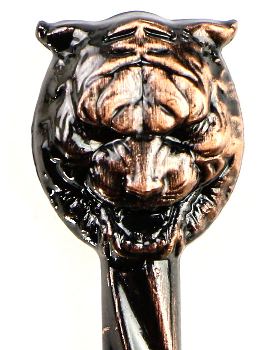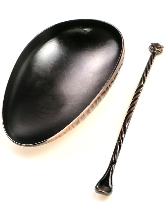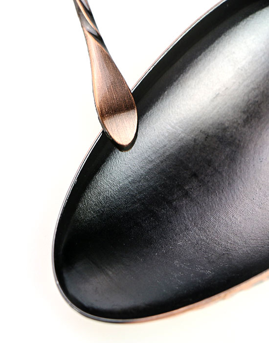 Чахэ изготовлено из металла с патинированной отделкой под старинную медь. Патина нанесена вручную и распределена неравномерно: тёмная в углублениях рельефа, более светлая на выступах — именно так выглядит настоящая антикварная медь, а не крашеный пластик. В отличие от бамбука, который со временем трескается и впитывает запахи, металл не деформируется, не темнеет от влажности и сохраняет форму при любом обращении.