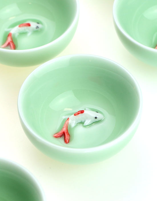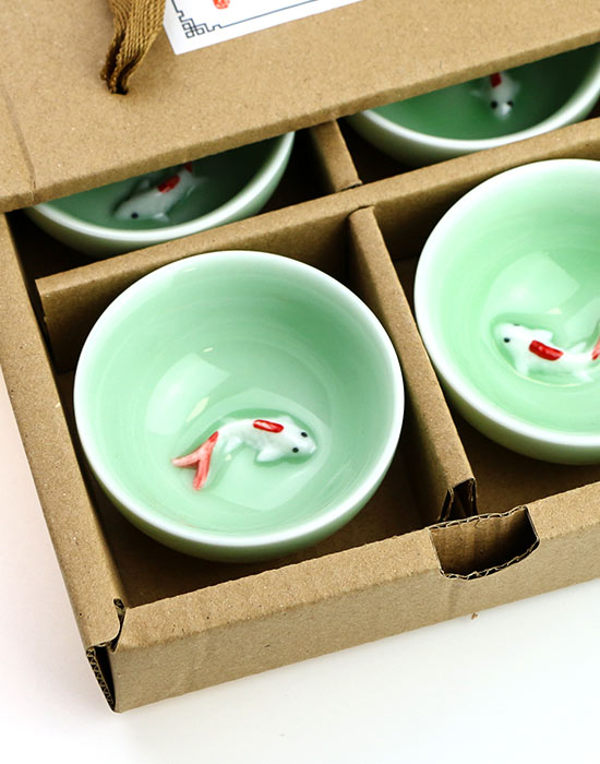 Подарочный набор из шести пиал с Золотой Рыбкой, чабэй для Гунфу Ча, чашка для чайной церемонии, керамика в бирюзовой глазури селадон, объём 50 мл