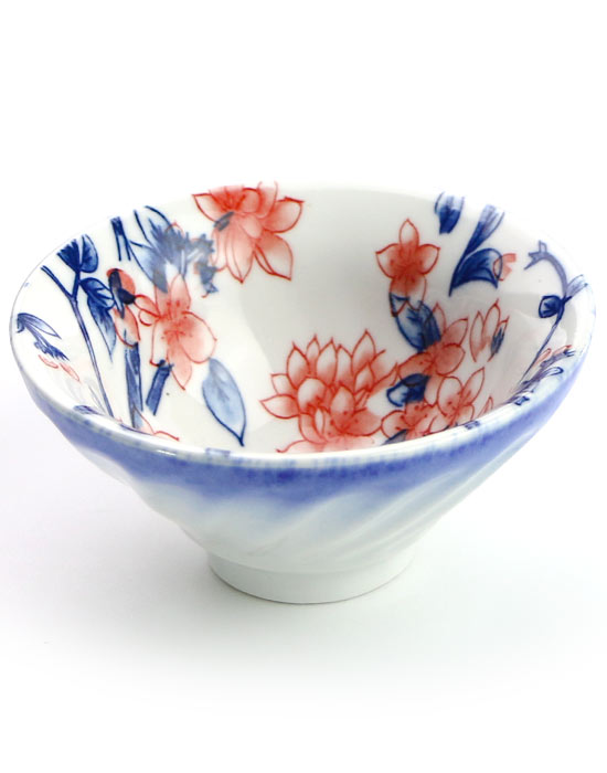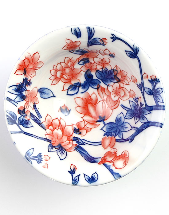 На пиале изображены цветущие ветви персикового дерева с двумя птицами, замершими в тихой беседе. Роспись выполнена в технике Цинхуа Юлихун (青花釉里红): кобальтово-синий и медно-красный пигменты наносятся под глазурь и обжигаются при высокой температуре, давая глубокий, немеркнущий цвет.