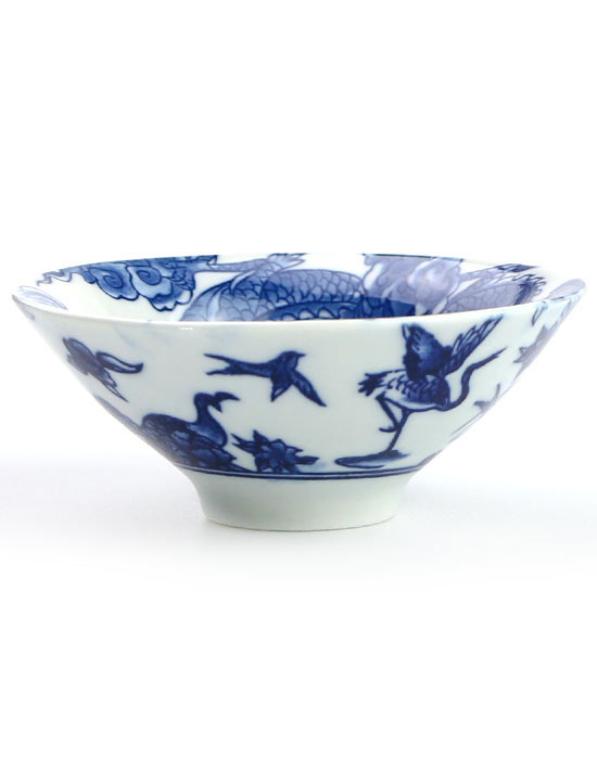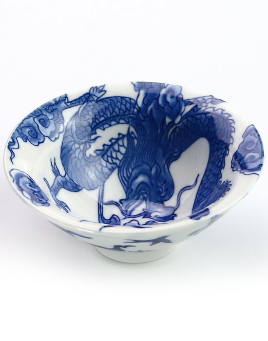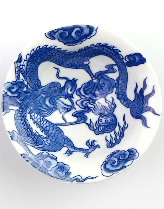 На белоснежном фарфоре — классическая роспись 青花 (цинхуа): пятикоготный дракон, охватывающий всё пространство чаши. Перед ним — огненная жемчужина (火珠, хо чжу), окружённая вихрями пламени и облаками.