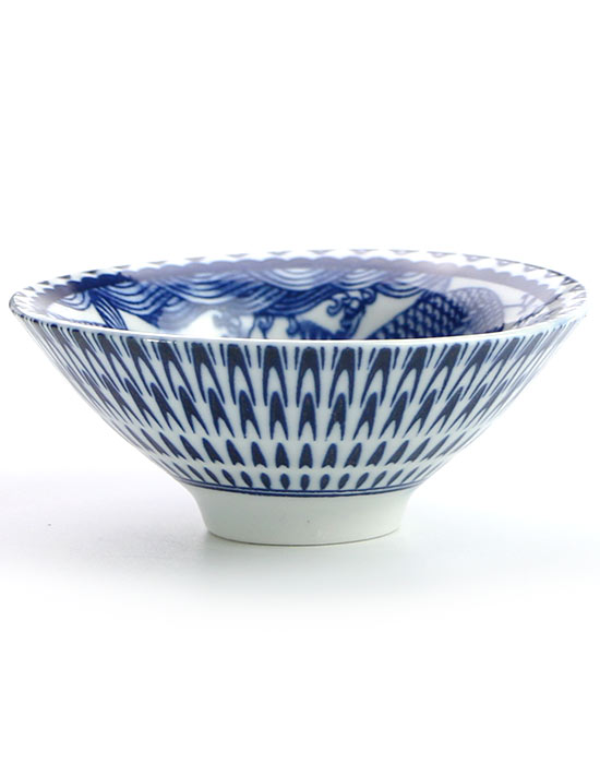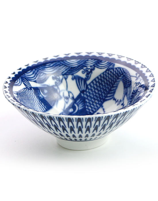 На белоснежном фарфоре в технике цинхуа (青花瓷) — синяя подглазурная роспись кобальтом — разворачивается живая композиция: два карпа кои в волнах, ветви цветущей сливы мэйхуа, лотос и иероглифы 连年有余 (lián nián yǒu yú). Перевод этой фразы — «из года в год пусть будет с избытком». И здесь скрыта тонкая игра смыслов: иероглиф 余 (избыток) звучит так же, как 鱼 (рыба) — поэтому карпы на пиале буквально нарисованы вместо слова. Это классический жанр китайского декоративного искусства — 吉祥图, благопожелательный рисунок-ребус, где образ и смысл неразделимы.