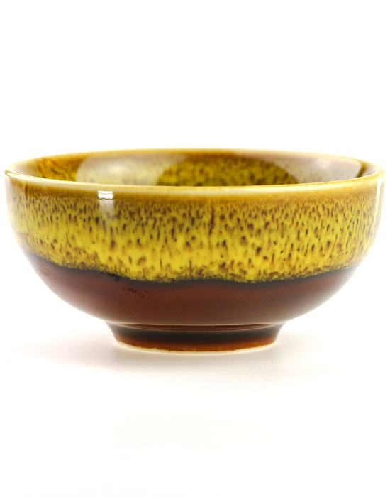 Жёлтая глазурь Тяньму — редкость. Если бирюзовый и тёмный варианты встречаются чаще, то золотисто-жёлтый оттенок Небесного Глаза (天目, tiānmù) исторически ассоциировался с императорской палитрой: в Китае жёлтый — цвет земли, центра мироздания и высшей власти. Именно такие чаши везли японские монахи с горы Тяньму в провинции Чжэцзян обратно в Японию, давая им имя тэммоку (天目, temmoku). Через Японию этот термин разошёлся по всему миру — и сегодня обозначает целое направление в керамике.