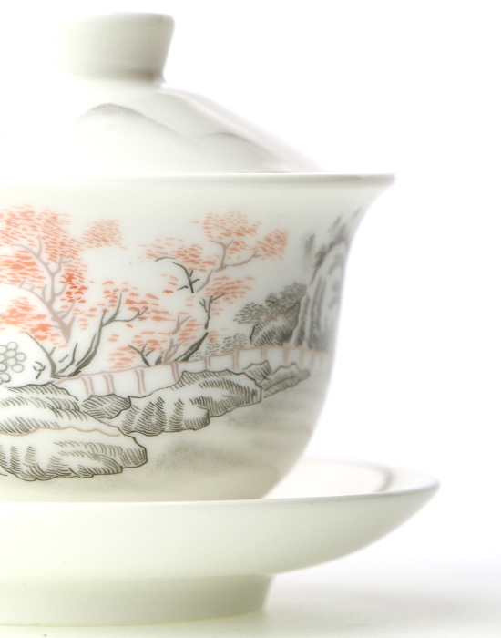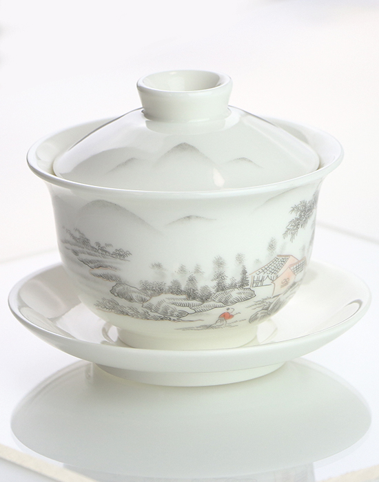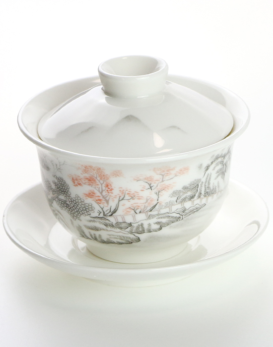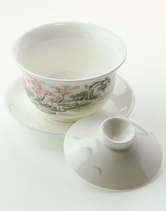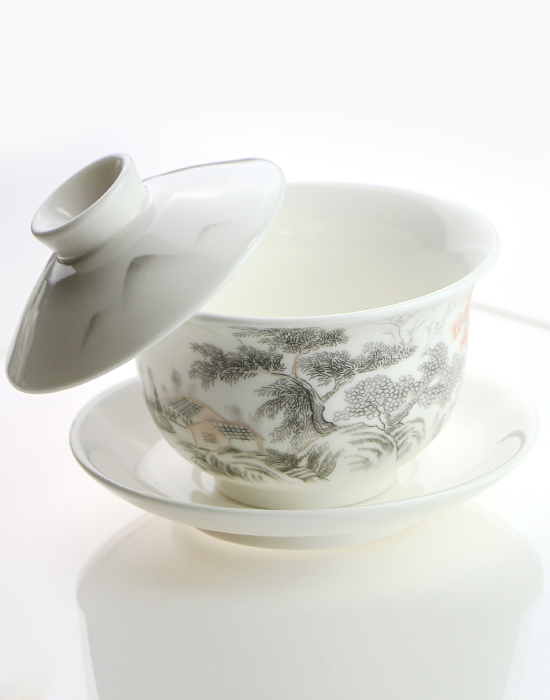 Вишукана гайвань зі знаменитої білої нефритової порцеляни Дехуа з тонким пейзажним розписом — це не просто чайний посуд, а маленький витвір мистецтва, який робить кожне чаювання усвідомленим і неквапливим.