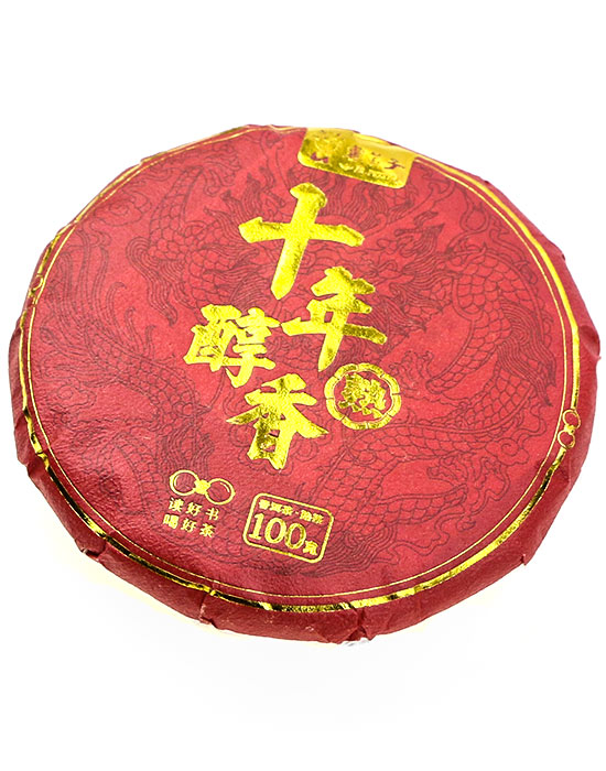 Китайський чай Шу пуер Ши Нян Чен Сян, 十年醇香普洱熟茶 , чай з сировини врожаю 2014 року, фабрика Ботанік, традиційний рецепт пресування в кам’яних формах, десятирічний чай з м’яким ароматом, вага 100 грамів